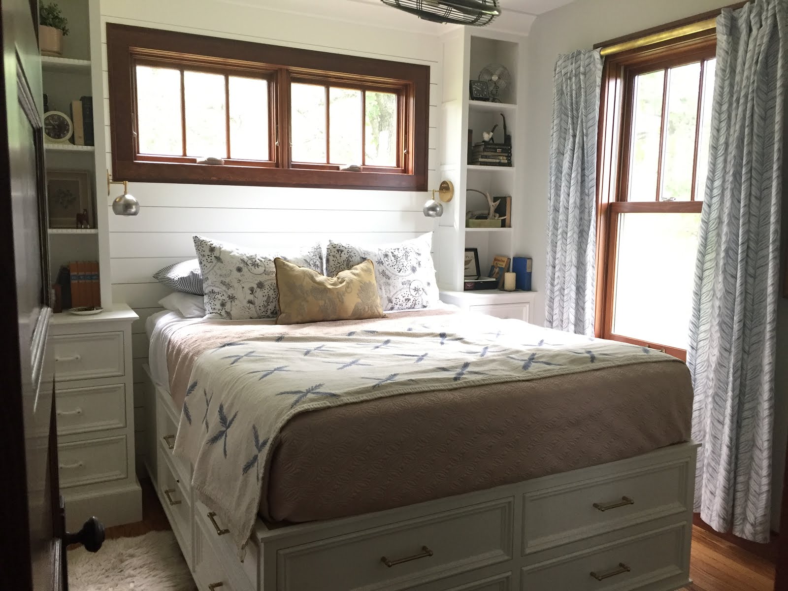 While reminiscing over Moxie, I saw my bedroom from last year. OMGoodgrief. It wasn't the worst, but it has changed a. lot. Andrew finished the bed (that we've talked about since buying the house 7 years ago!) and wired new sconces from this Etsy shop. I painted the walls and wardrobe BM Moonshine and picked a few new textiles for the room.